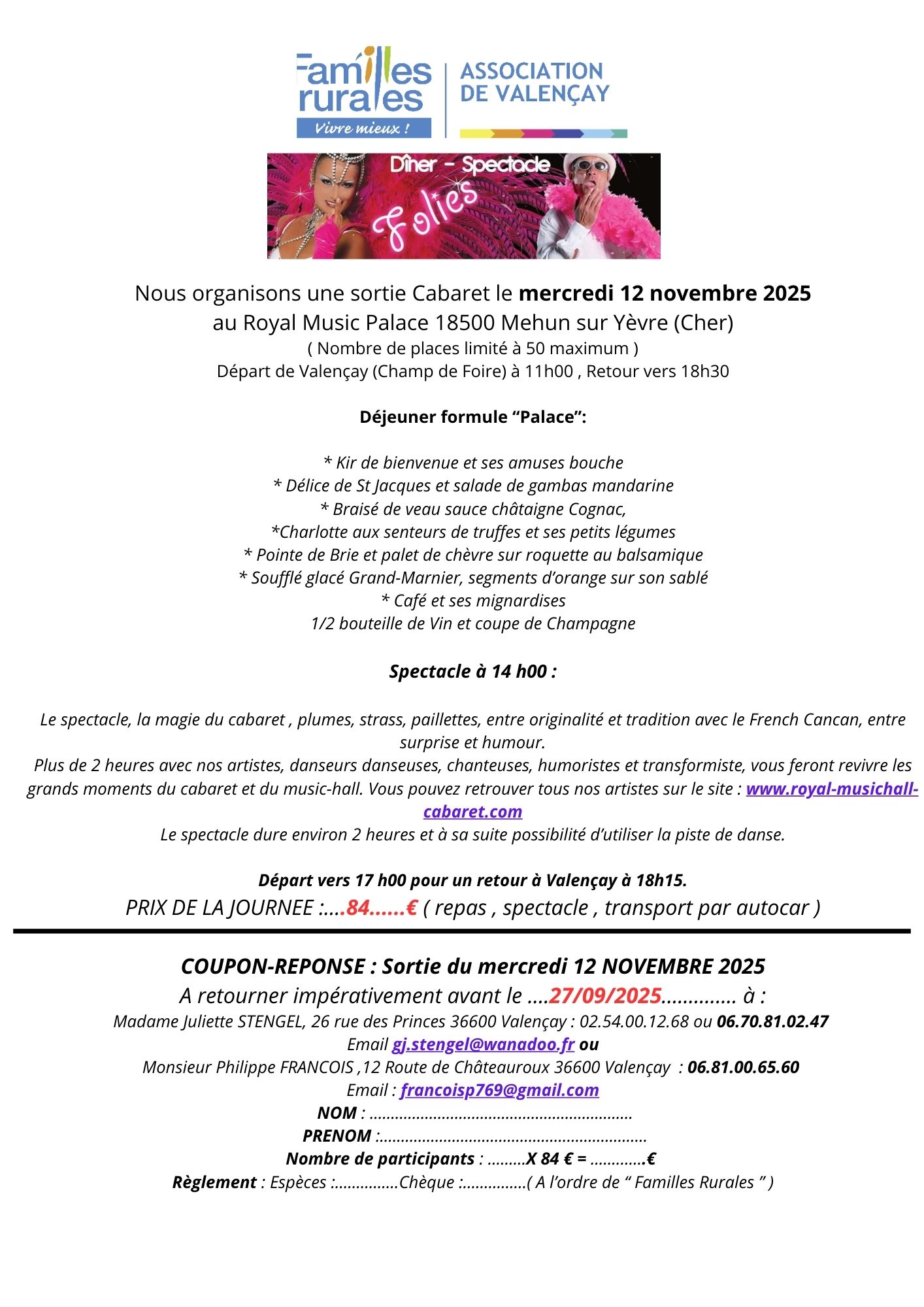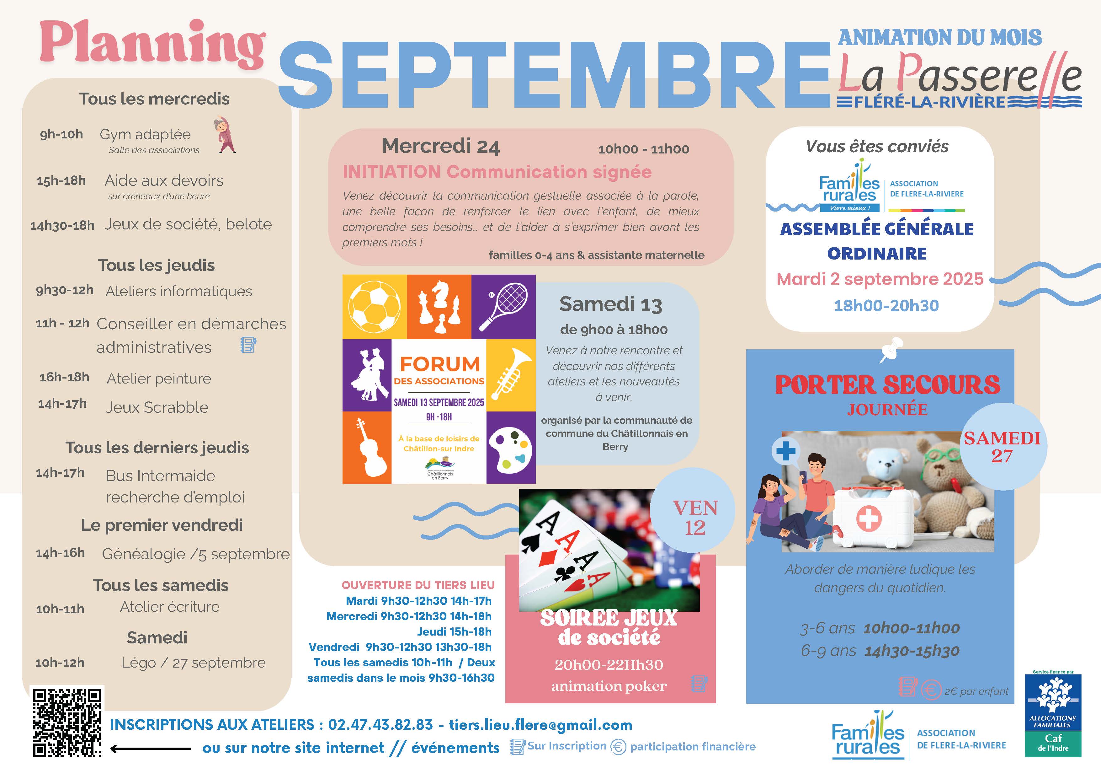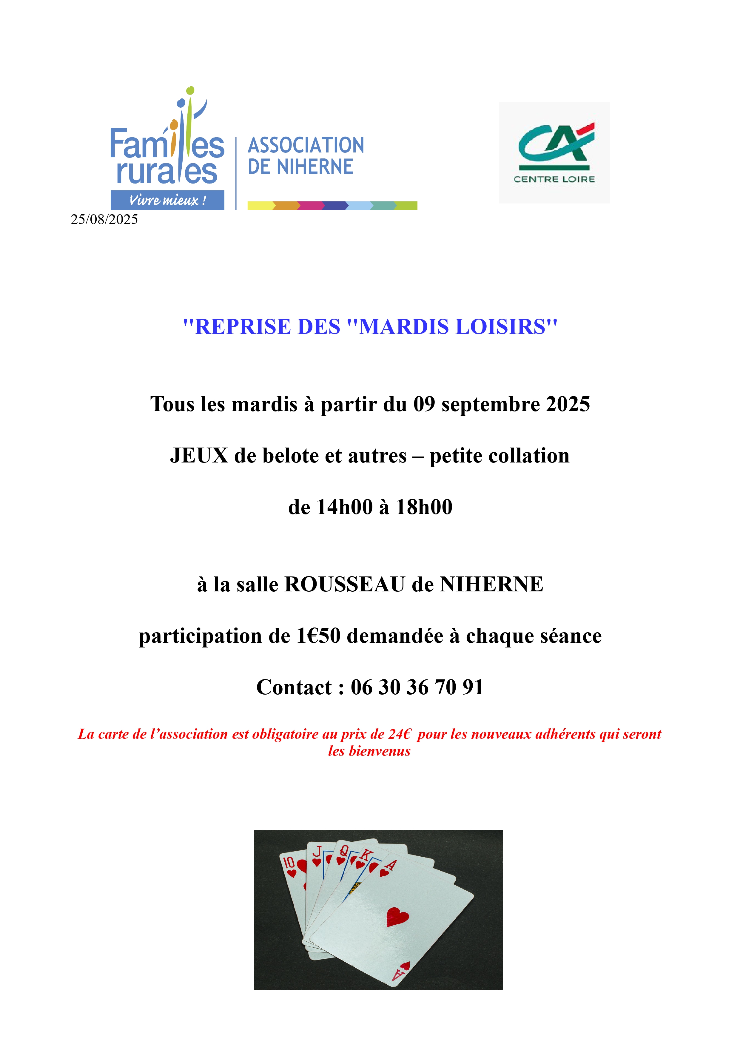 Activités et manifestations de l'AFR de Maillet - 2025 Après-midi jeux - AFR de Cluis Atelier couture - AFR de Cluis Cours de gym - AFR de Cluis Activités - AFR Le Poinçonnet Cours de danse - AFR de Niherne Cours de Yoga - AFR de Niherne Mardi Loisirs - AFR de Niherne Cours de gym - AFR de Lourdoueix Saint-Michel Loto - AFR de Luant Atelier d'écriture - Mutualité Française Invitation cabaret - AFR de Valencay Soirée Tartiflette - AFR Lye Fontguenand Randonnée - AFR de Mosnay Marche scandinave - AFR de Poulaines Visite Château de Valencay - AFR de Lignac Sophrologie - AFR de Bouesse Activités septembre - Tiers Lieu "La Passerelle"