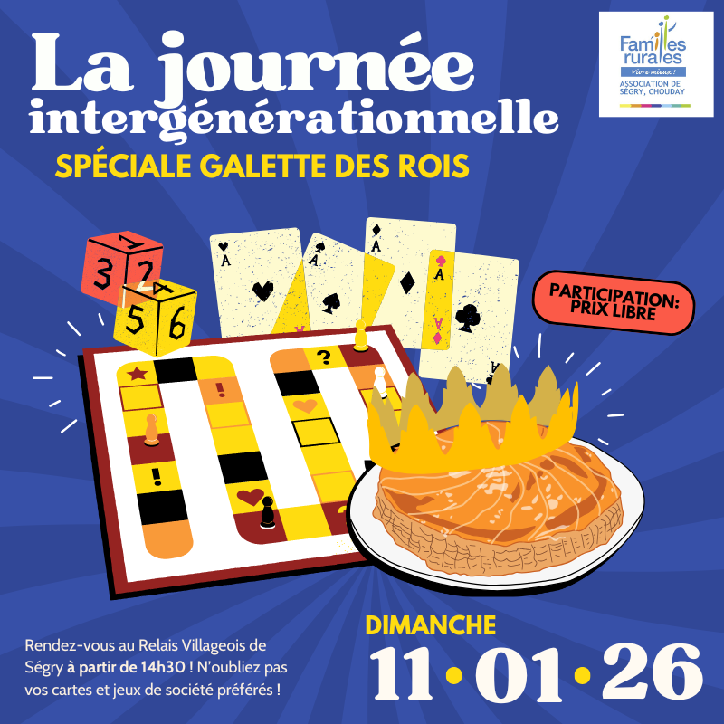 Sur cette page, retrouvez les affiches des animations et événements — ponctuels ou récurrents — organisés par les associations Familles Rurales de notre département. évènements ponctuelsPlanning - Lourdoueix Saint MichelRepas St VALENTIN - ValençayThéâtre - Neuillay les BoisPlanning Janvier - La PasserelleBal Trad - CironSt Vincent - Segry ChoudayGalettes des rois - Segry Chouday évènements récurrentsGalerie d’images